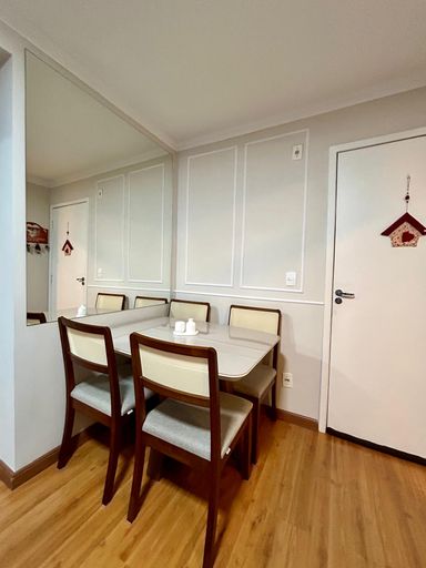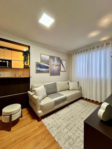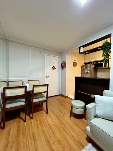Esse apartamento, conta com 02 dormitórios, banheiro social, cozinha, sala de estar e de jantar, área de serviço e 01 vaga de garagem.